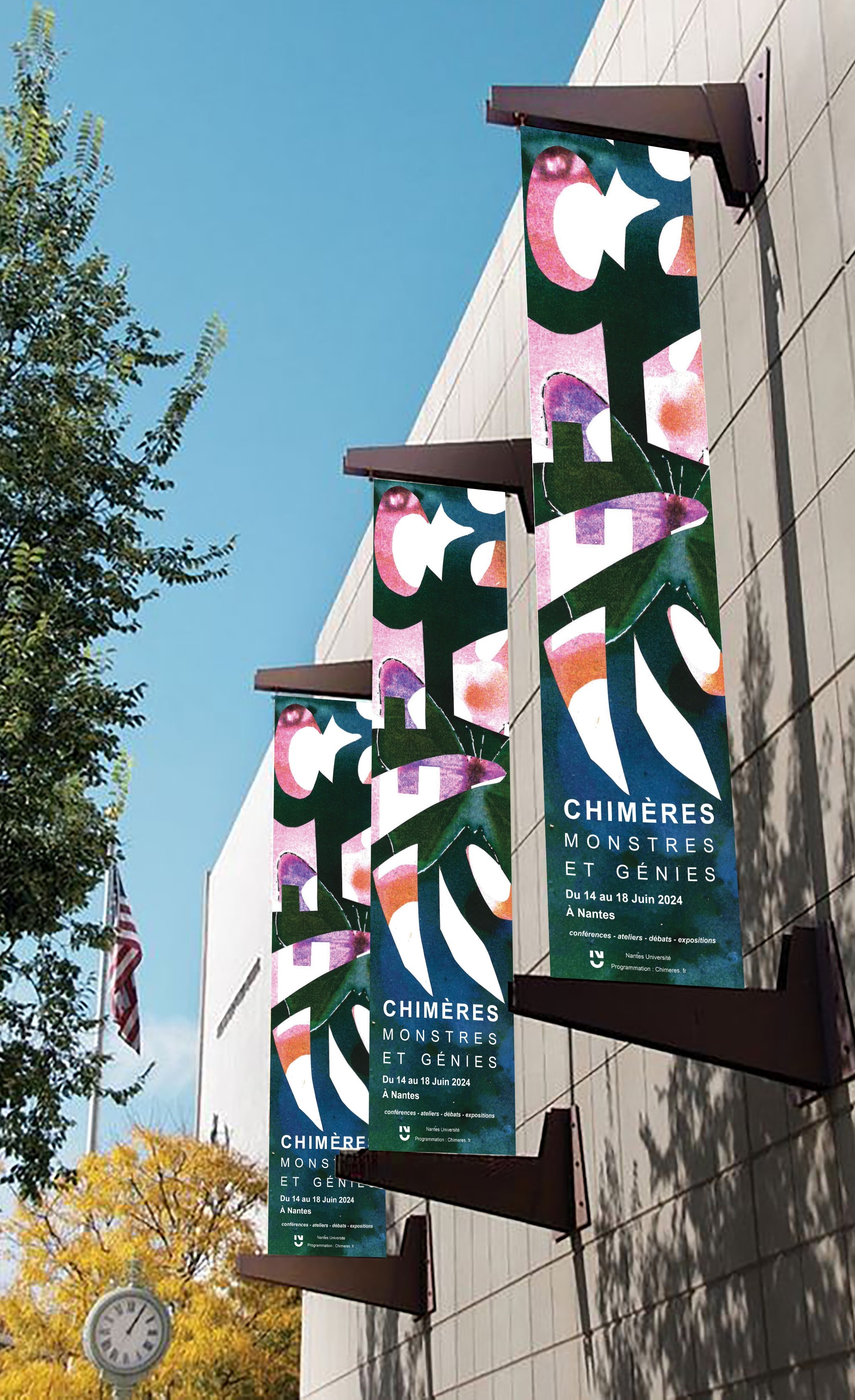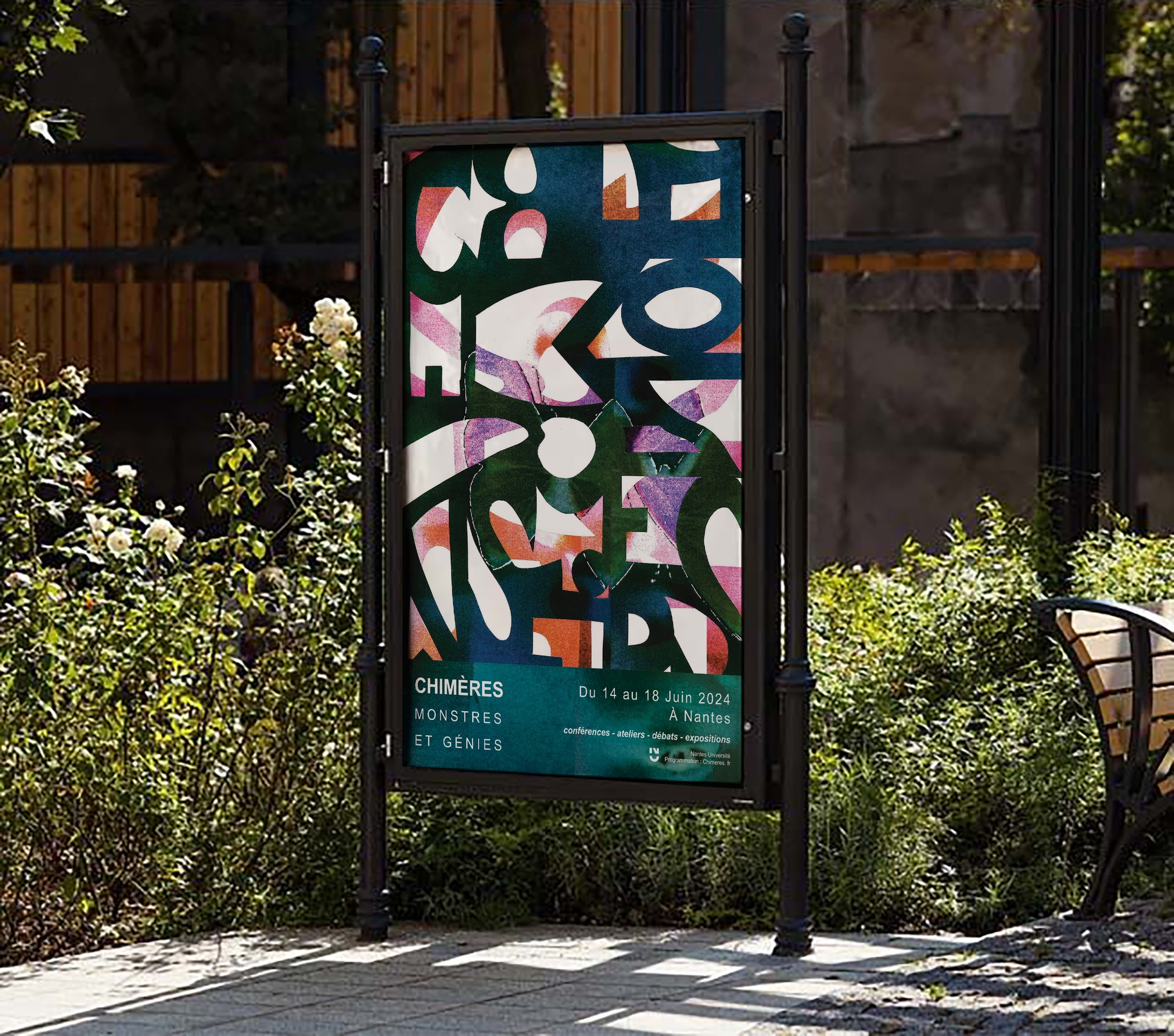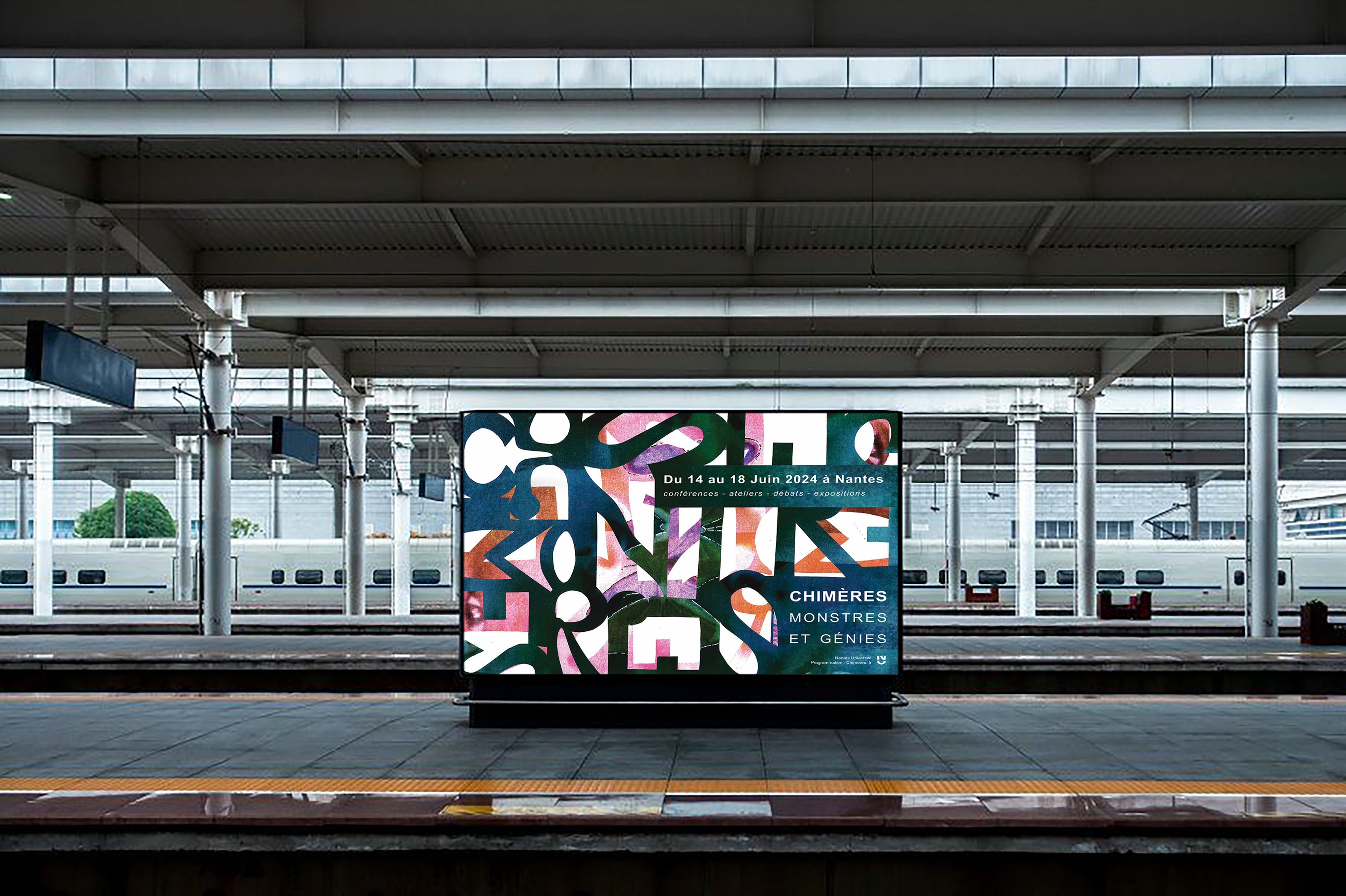 Affiches réalisées à partir de la superposition de deux découpes photographiques, évoquant une atmosphère mystique. Les découpes intègrent une composition de lettres aux styles variés, dessinées à la main, rappelant l’hybridité et le thème de l’exposition. Le fond a été réalisé manuellement, tandis que la typographie a été retravaillée sur Adobe InDesign pour un rendu final plus abouti. Décliné en format kakemono et 3:4.