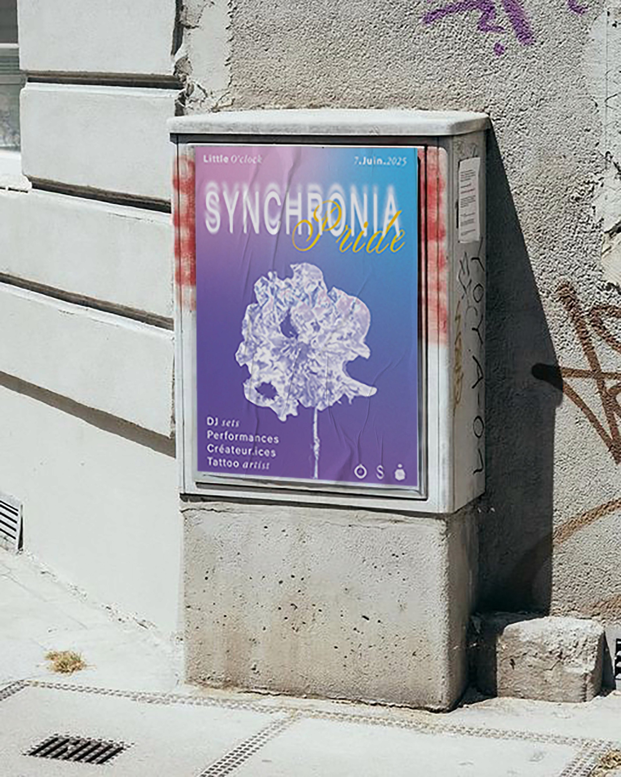 Synchronia Collectif est une association culturelle qui organise des événements musicaux à Toulouse, apportant sa propre vision à la scène : une expérience libre et immersive avec de la techno hypnotique et envoûtante. Pour exprimer ces valeurs dans le logo, j’ai utilisé un effet de flou pour évoquer le mouvement de la danse, ainsi qu’une atmosphère tamisée et intime.