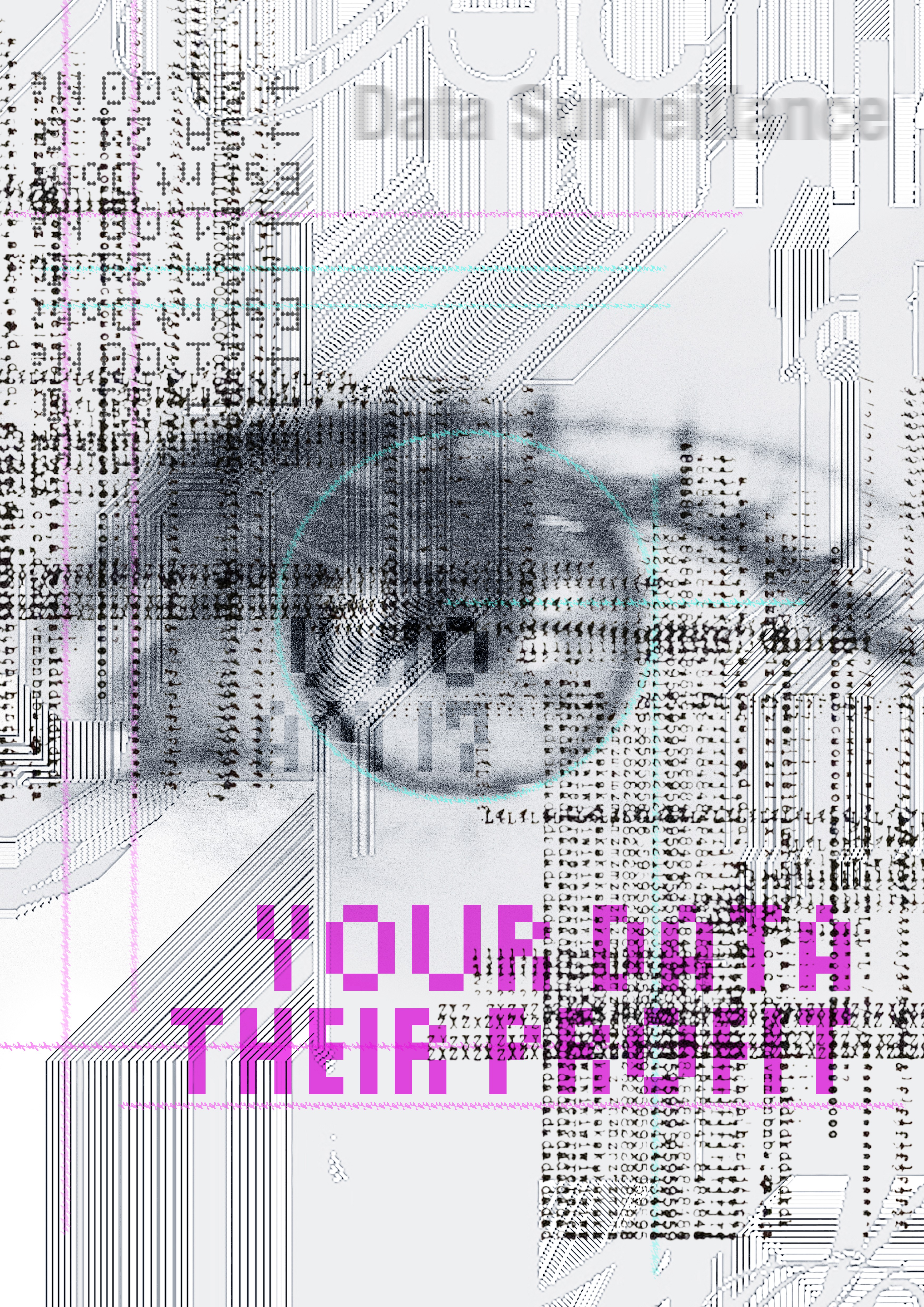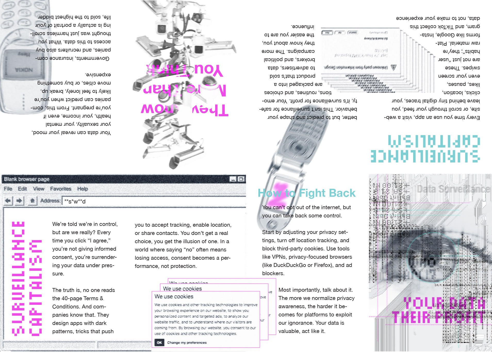 J’ai réalisé une affiche A3 pliable destinée à créer un zine A6 sur le thème de la cybersécurité. J’ai utilisé des images de caméras de surveillance, des références au web comme des messages d’erreur, et des téléphones anciens pour créer un contraste avec notre époque technologique.