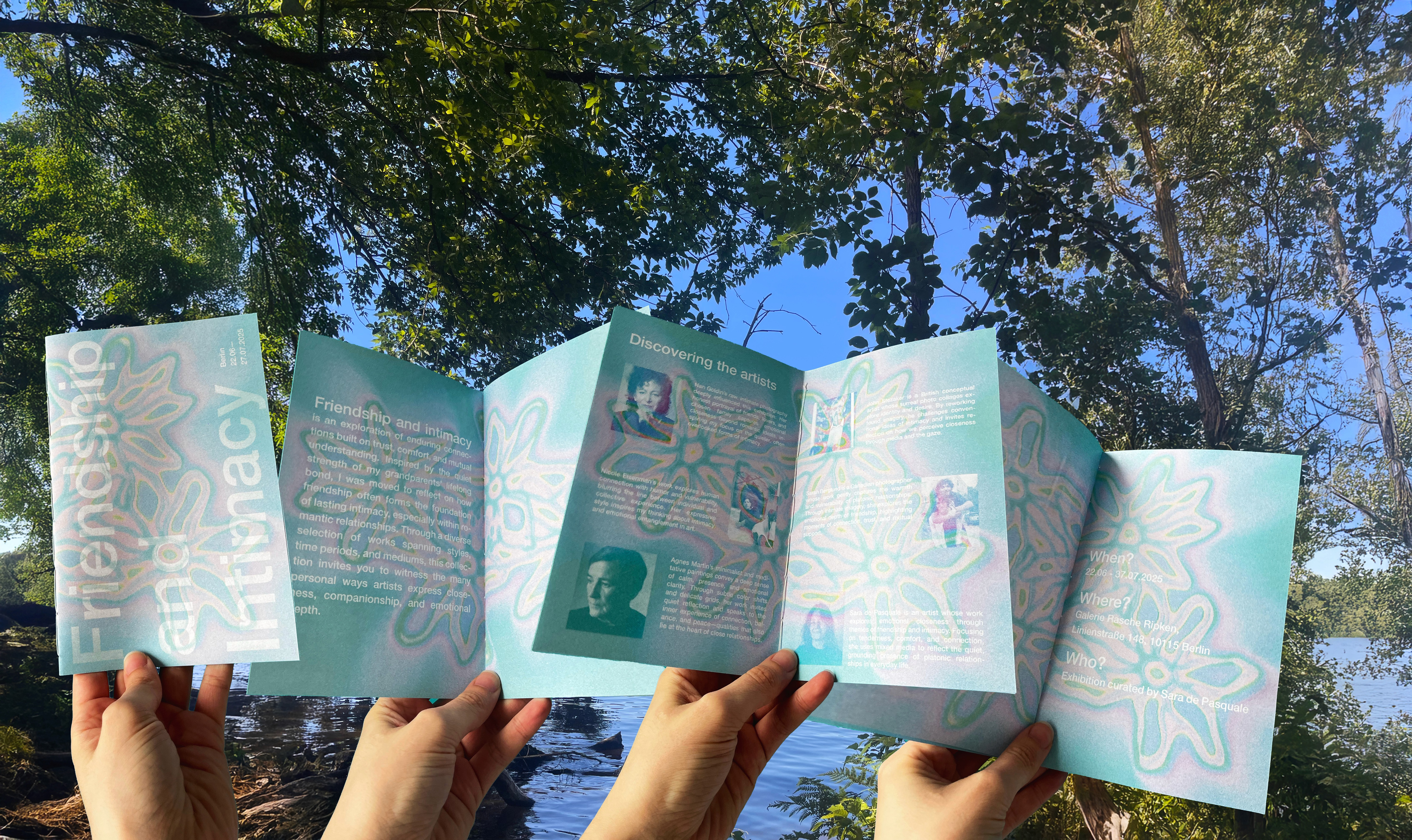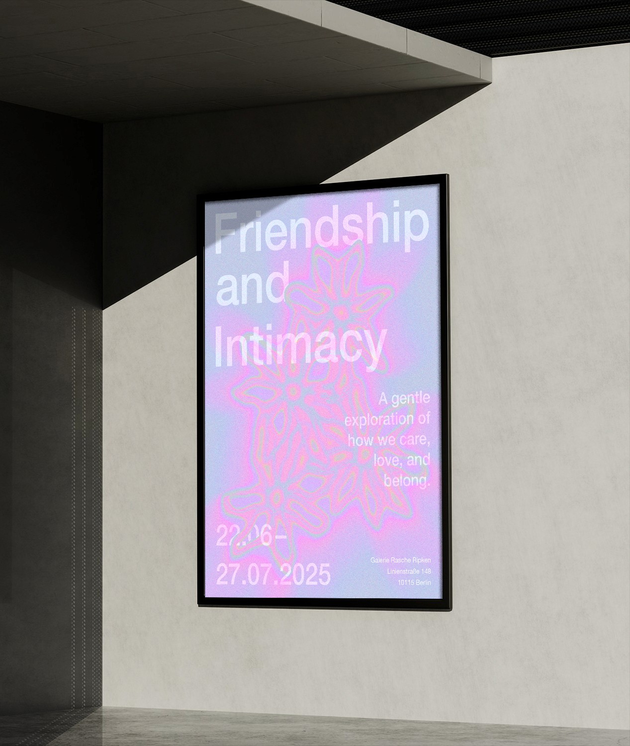 Pour ce projet, j’ai imaginé une exposition fictive réunissant cinq artistes (Nan Goldin, Nicole Eisenman, Agnes Martin, John Stezaker et Sarah Berglund), explorant le thème de l’amitié et de l’intimité dans leurs œuvres. J’ai créé une affiche douce, jouant sur la transparence pour évoquer la tendresse de l’amitié.