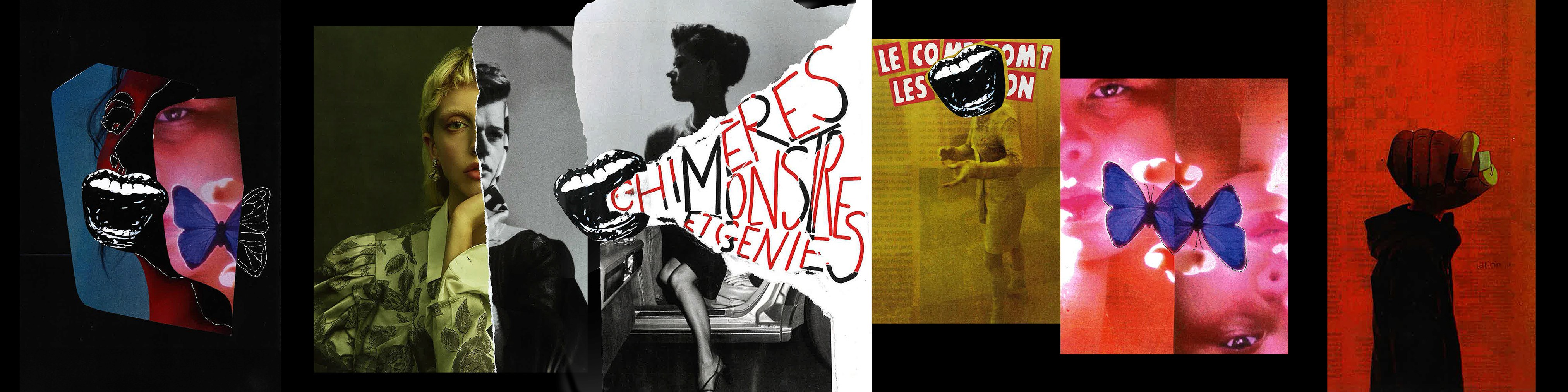 Compositions de collages réalisées autour du thème des chimères, des monstres et des génies, explorant les notions d’hybridité et de transformation.